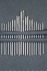- bout pointu : 6 aiguilles longues n° 5 – 6 aiguilles longues n° 7 – 4 aiguilles longues n° 9 – 2 aiguilles à repriser n° 3 et 2 aiguilles à repriser n° 5 – soit 20 aiguilles ;