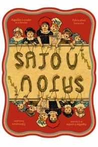 L’extérieur représente des enfants tenant les lettres du mot SAJOU, Paris. L’intérieur est un motif floral dans les tons de rouge et jaune.
