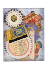 Cette boîte est composée de deux plateaux, celui du dessus étant amovible et pourvu, de chaque côté, de deux petits rubans Sajou facilitant la préhension. Elle est recouverte d’un de nos papiers bleu et blanc, le motif des plateaux pouvant être différent. Le couvercle est, à l’extérieur, revêtu de l’étiquette Enfants dans un Thêatre , l’intérieur est décoré d’une étiquette rectangulaire Fil Au Conscrit .
