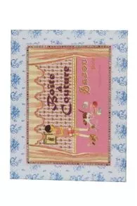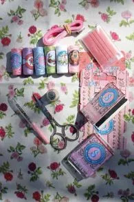 Cette boîte à couture dans les tons roses et pastel a été spécialement conçue pour les petites filles. Son étiquette représente une jeune fille dont le chat fait bien des bêtises avec des pelotes de laine et des bobines de fil.