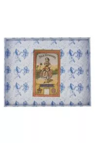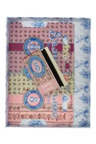 Cette boîte est composée de deux plateaux, celui du dessus étant amovible et pourvu, de chaque côté, de deux petits rubans Sajou facilitant la préhension. Elle est recouverte d’un de nos papiers bleu et blanc, le motif des plateaux pouvant être différent. Le couvercle est, à l’extérieur, revêtu de l’étiquette Jeune Fille et son Chat , l’intérieur est décoré d’une étiquette rectangulaire Fil À l’Indienne .