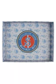 Cette boîte est composée de deux plateaux, celui du dessus étant amovible et pourvu, de chaque côté, de deux petits rubans Sajou facilitant la préhension. Elle est entièrement recouverte d’un de nos papiers bleu et blanc, le motif des plateaux pouvant être différent. Le couvercle est, à l’extérieur, revêtu d’une étiquette représentant une vue panoramique de Paris avec les principaux monuments de la capitale, l’intérieur est décoré d’une étiquette ronde Articles de Paris.