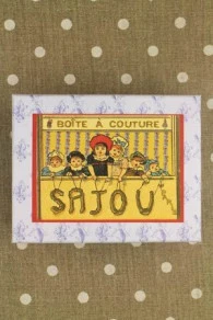 Boîte à couture vide décorée de notre étiquette Enfants dans un petit théâtre, composée de deux plateaux intérieurs, celui du dessus étant amovible et pourvu, de chaque côté, de deux petits rubans Sajou facilitant la préhension.