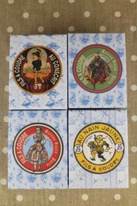 L’étiquette sur le dessus du couvercle représente la couverture de nos albums de broderie Sajou mauves et l’étiquette à l’intérieur du couvercle représente le dos de ces mêmes albums.