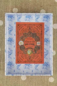 L’étiquette sur le dessus du couvercle représente la couverture de nos albums de broderie Sajou rouges et l’étiquette à l’intérieur du couvercle représente le dos de ces mêmes albums.
