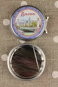 - une autre boîte décorée d’un dessin représentant le Louvre et sa Pyramide et contenant un assortiment d’une trentaine d’aiguilles dans quatre modèles (coudre, repriser et mode pour les bouts pointes et tapisserie pour les bouts ronds).