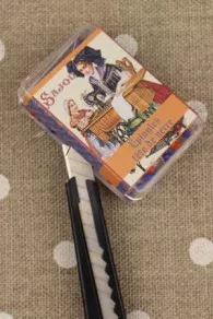 La boîte est recouverte d’une étiquette représentant une Alsacienne sur sa machine à coudre à pédale. Pour l’ouvrir sans endommager l’étiquette, il vous suffira, avec un cutter, de fendre cette dernière de chaque côté.
