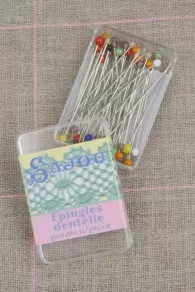 Ces épingles sont plus fines que nos épingles extra-fines : leur diamètre est de 0,40 mm et leur longueur de 36 mm. Leur tête est en verre de Murano.
