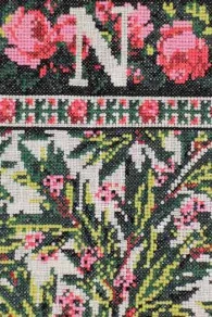 Le motif floral étant somptueux, j’ai choisi, pour son interprétation au point de croix, de laisser un fond uni écru de manière que fleurs et feuillages se distinguent bien. Nous vous proposons ici une grille permettant de réaliser un grand coussin reprenant le motif central et les bordures des tentures de la petite chambre de l’Empereur au château de Fontainebleau.