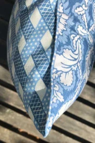 Housse de coussin 40 x 40 cm dont une face est faite de notre tissu Damas bleu et l’autre face dans son coordonnĂ© 1 Ă motif de croisillons. La finition est très raffinĂ©e, avec un passepoil dans le coordonnĂ© Damas n° 2, Ă pois Ă©crus sur fond bleu. Au dos, la fermeture se fait en portefeuille, avec un croisement large du tissu afin que cela ne baille pas. Étiquette Sajou bleu au dos. Ce format 40 x 40 est standard et vous trouverez très facilement un coussin pour garnir cette housse.