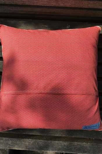 Housse de coussin 40 x 40 cm dont une face est faite de notre tissu Damas rouge et l’autre face dans son coordonné 2 à pois écrus sur fond rouge. La finition est très raffinée, avec un passepoil dans le coordonné Damas n° 1, à motif de croisillons. Au dos, la fermeture se fait en portefeuille, avec un croisement large du tissu afin que cela ne baille pas. Étiquette Sajou bleu au dos. Ce format 40 x 40 est standard et vous trouverez très facilement un coussin pour garnir cette housse.