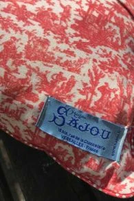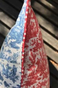 Housse de coussin 40 x 40 cm dont une face est faite de notre toile de Jouy Offrande à l’Amour miniature en bleu et l’autre face dans le même motif en rouge. La finition est très raffinée, avec un passepoil à pois écrus sur fond rouge, assorti au tissu. Au dos, la fermeture se fait en portefeuille, avec un croisement large du tissu afin que cela ne baille pas. Étiquette Sajou bleu au dos. Ce format 40 x 40 est standard et vous trouverez très facilement un coussin pour garnir cette housse.