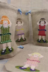 Elle a les cheveux blond clair et sa robe est dans les rose et vert. Elle est brodée de face sur le devant du sac et de dos sur l’arrière sur du lin 12 fils au cm.