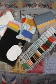 – 8 carrés de lin 14 x 14 cm : 1 x mousse, toucan, azalée, bleu Sajou et 4 x noir ;