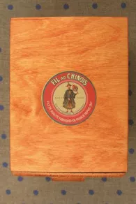 Petit meuble en bois décoré sur le dessus et chacun des côtés d’une étiquette ronde Fil Au Chinois rouge.