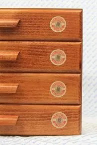 Inspiré par un modèle ancien, ce meuble est une fabrication de grande qualité. Il est en contreplaqué de bouleau et son corps est cloué-collé. Le devant des tiroirs est fait en bois de peuplier. L’extérieur est teinté couleur merisier, comme les autres objets de notre collection d’objets en bois, l’intérieur des tiroirs étant laissé naturel. Le dessus et chacun des côtés sont décorés d’une grande étiquette ronde aux couleurs du Fil Au Chinois de 15,5 cm de diamètre. Chacun des quatre tiroirs est décoré de deux étiquettes rondes Fil Au Chinois identiques, soit huit étiquettes sur les tiroirs.