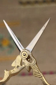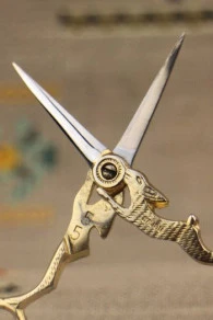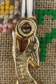 Cette paire de ciseaux à broder dorée représente un lièvre. Elle est entièrement fabriquée à la main. L’aurification nécessite que soit posé un vernis sur toutes les parties qui ne doivent pas être dorées. C’est ce qui explique la différence de prix entre les ciseaux Lièvre chromés et ceux-ci. Remarquez la finesse des détails de la fourrure de l’animal, de ses yeux, de ses oreilles…, ainsi que la qualité de la vis. Les lames, également sont extrêmement pointues.