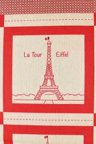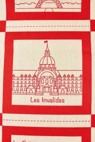 Ce tissu représente 36 monuments ou lieux parisiens dessinés en rouge sur fond coloris écru: Notre-Dame, l’Arc de Triomphe, la tour Eiffel, le Pont Neuf, le Moulin rouge, l’Opéra Garnier, etc., et même la… boutique Sajou ! Chaque dessin comporte un cadre rouge puis des pointillés et, tout autour, se trouve un petit motif imprimé dans les tons bleu, blanc et rouge. L’ensemble forme un motif de 1,50 m sur 1,50 m, le prix correspondant à un motif entier.