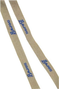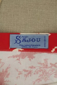 Ce sac rectangulaire comporte une face en toile de Jouy ombres chinoises rouges et l’autre face dans le même tissu inversé. Les anses sont faites d’une sangle de lin de 2 cm de large qui, tous les 8 cm est sérigraphiée du nom de Sajou en bleu. Les anses mesurent 66 cm et la sangle est en double, pour plus de confort.